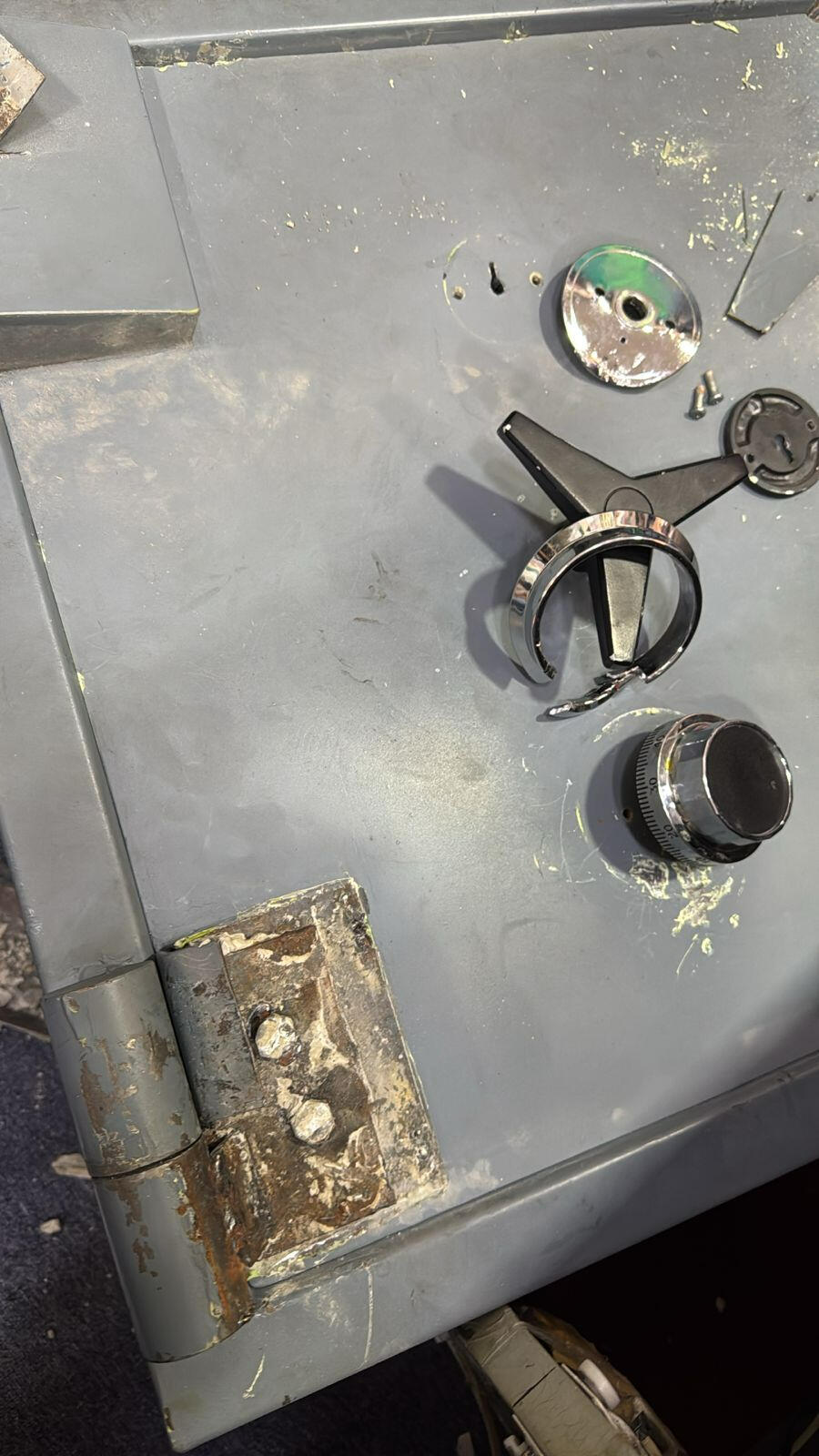 This safe underwent a break-in attempt when the store was broken into by a thief. The perpetrator damaged the hinges, tampered with the keyhole, and tried to force it open using various tools. However, the safe remained tightly shut and all its contents were secure.